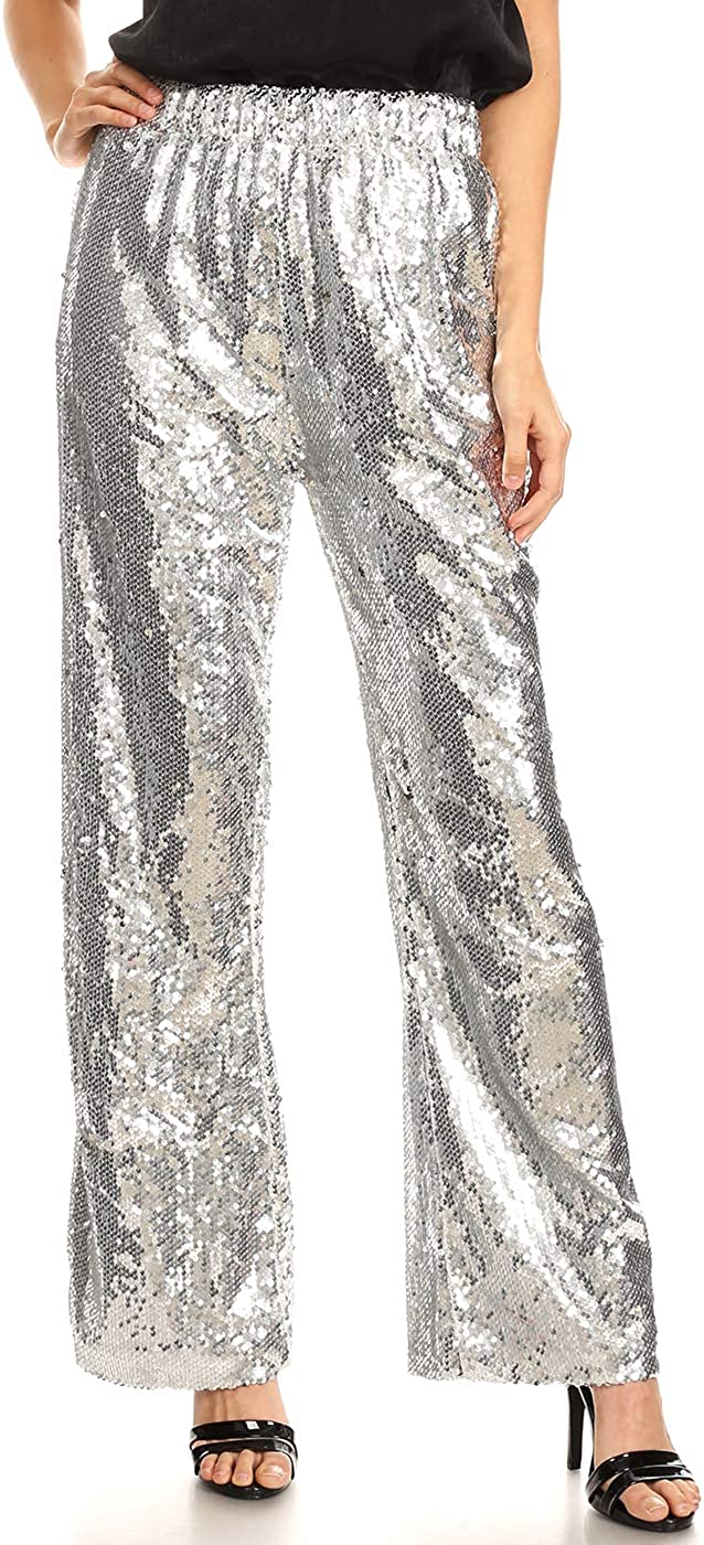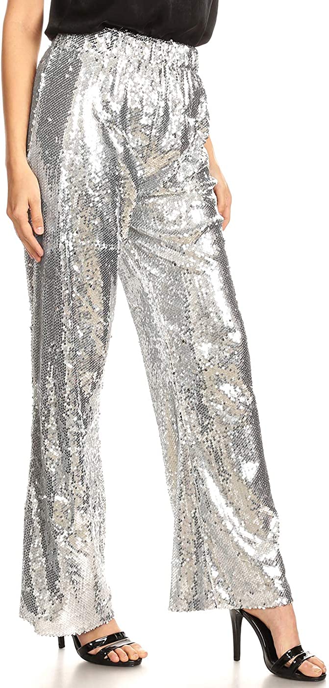 Women's Elastic Waist Sparkly Sequin Pants, 70's Disco Wide Leg Flare Pants, Party Jumpsuits Rompers