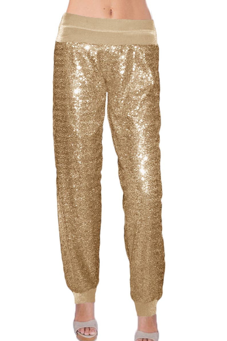 Gold Bungee Sequin Pants, Sequin Pants with Soft Stretch Velvet Waistband, Sparkle Pants
