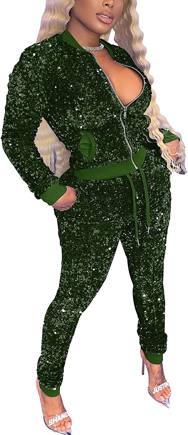 NRTHYE Sparkly Sequin Two Piece Set for Women Fall Sport Suit Zipper Sweatshirts Jacket Top and Shorts Tracksuit Clubwear