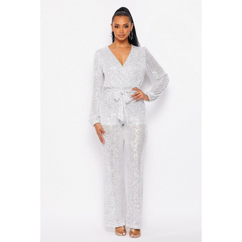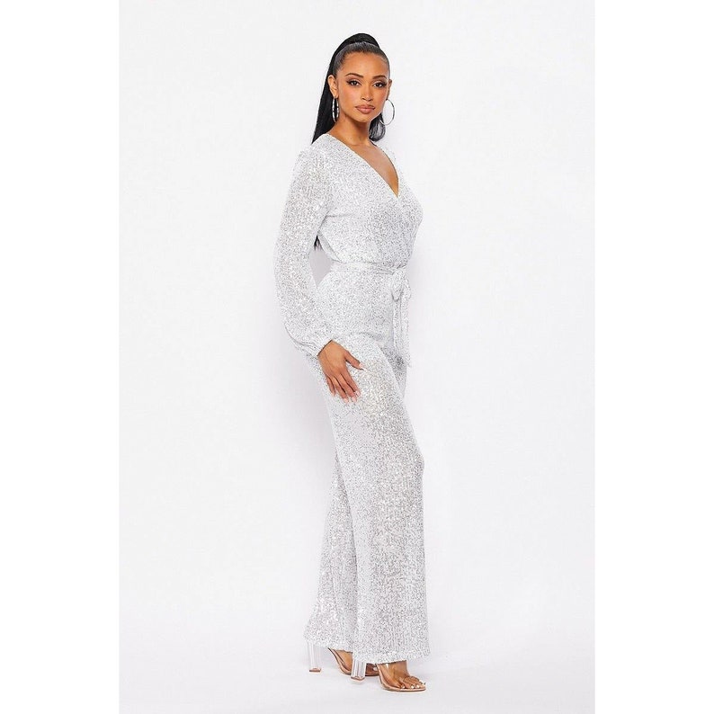 These Silver Sequin Long Sleeve Belted Jumpsuit are one of a kind outfit that you can wear at any event. The fabric is soft and comfy making it the perfect time of year to wear these pants. Style these pants with a sequin top, some heels and a clutch for a fancy night out or dress them down with sneakers, crop top or blazer for the day and be irresistible wherever you go! The perfect Silver Sequin Long Sleeve Belted Jumpsuit so you do not go unnoticed.