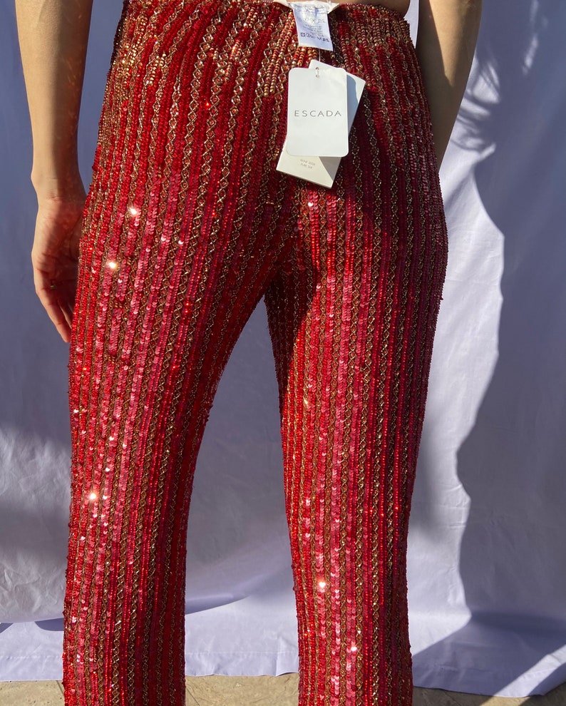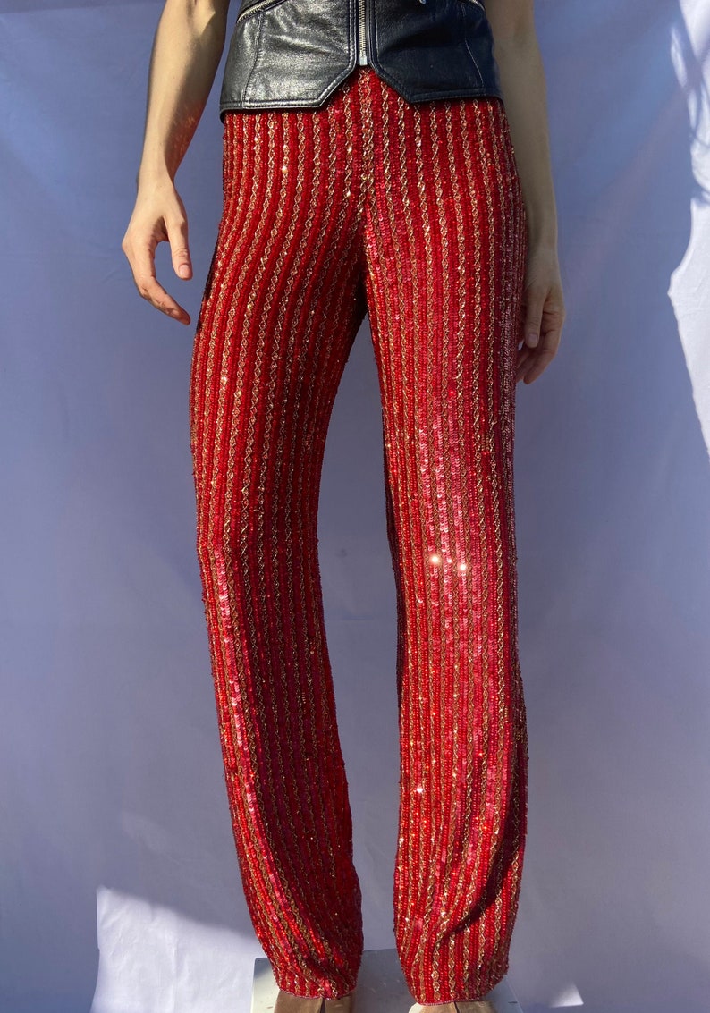 Here it is. These Fully Sequinned Red Trousers are fun to wear and work well with your casual or formal attire. They are a must-have in your wardrobe!