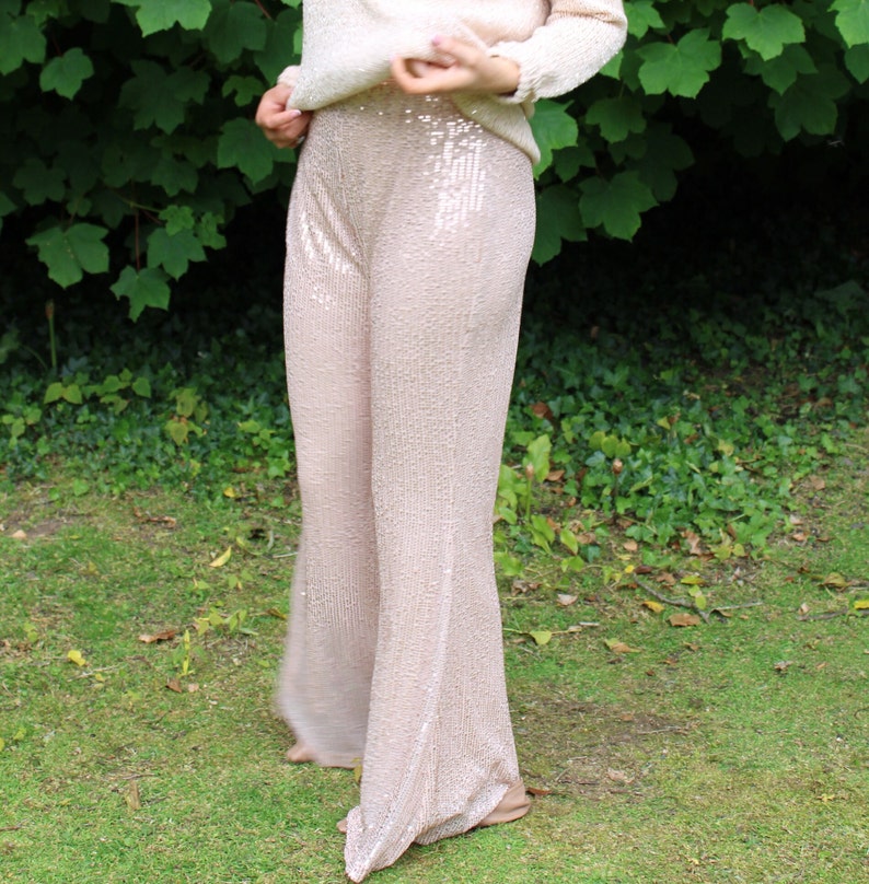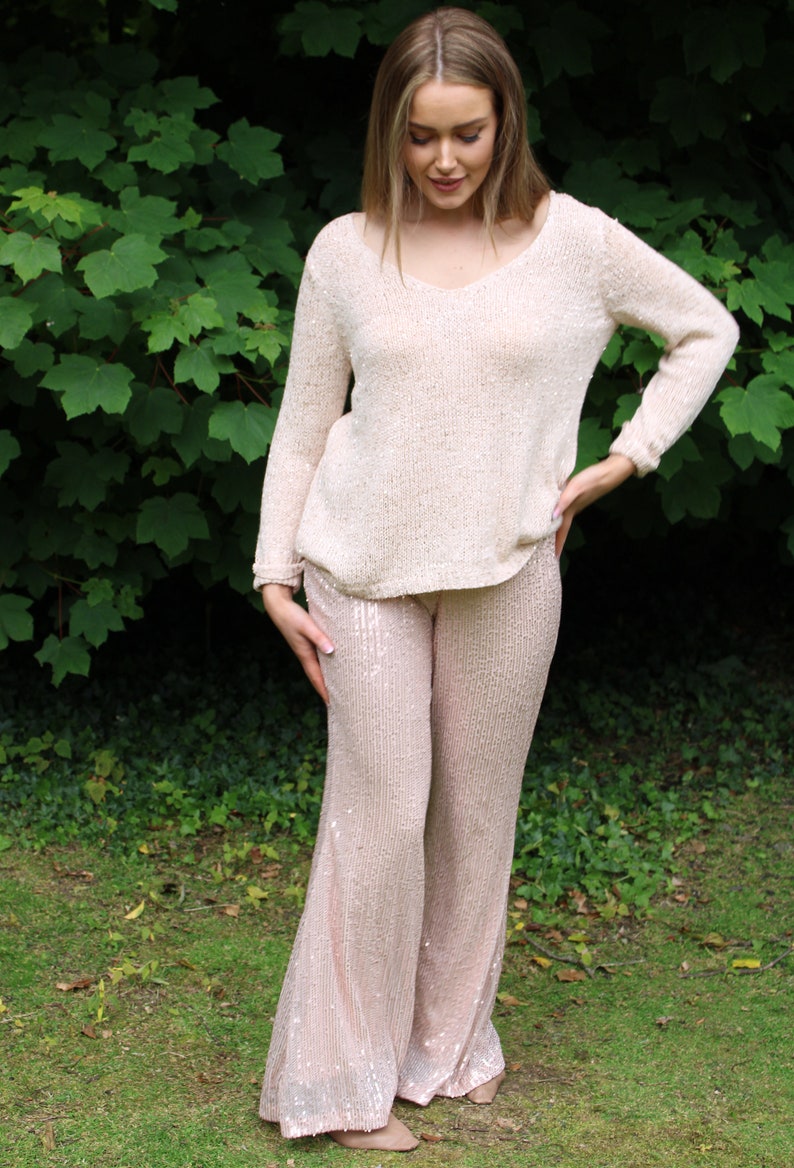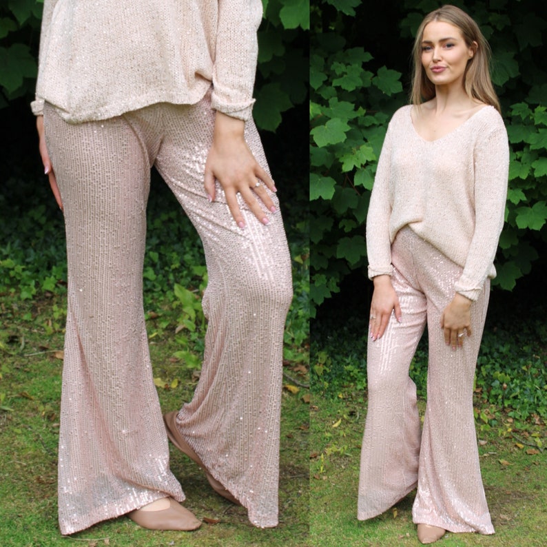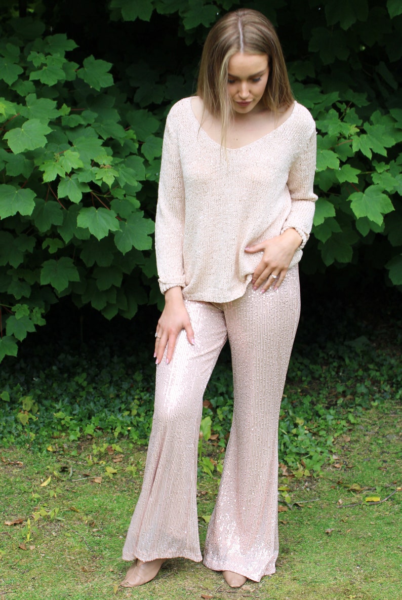 Rose Gold Sequin Pants, Fancy Occasion Stretch Leggings, Wide Flare Palazzo Leg Pants, Bridesmaids Party Wedding