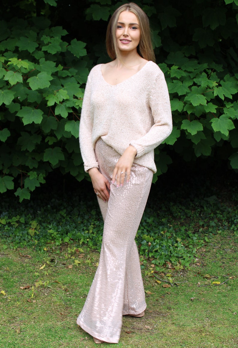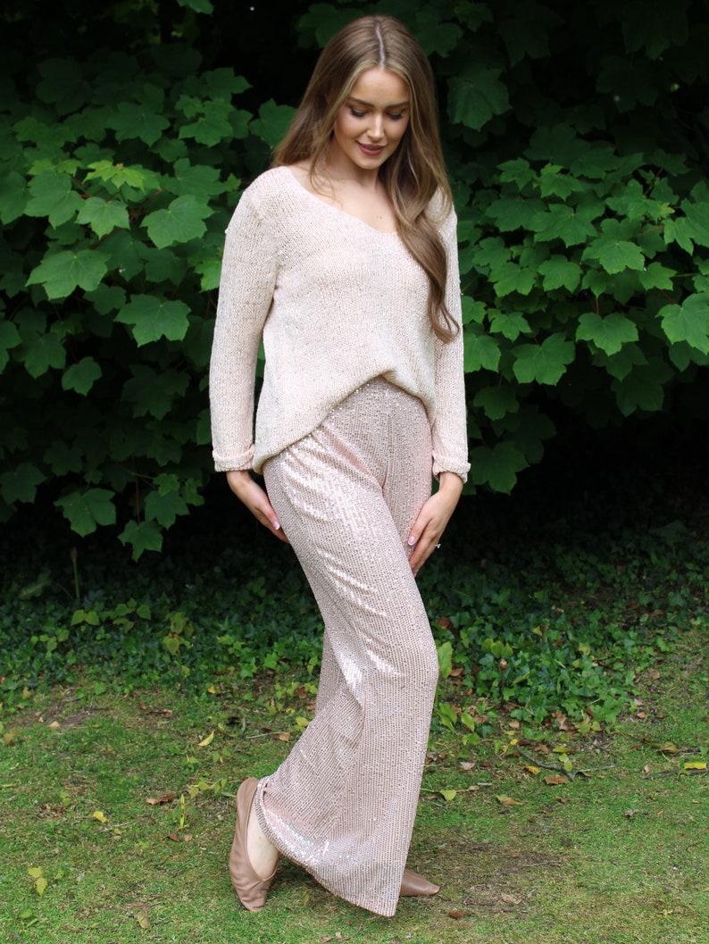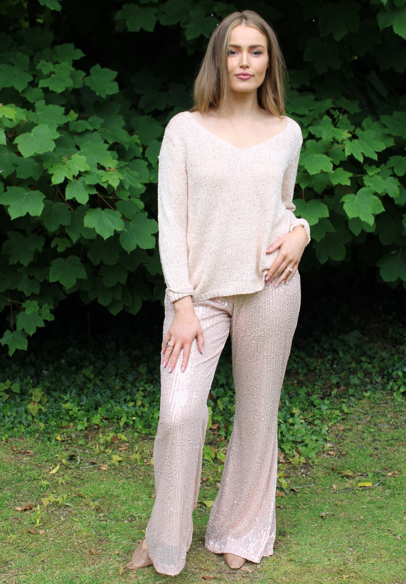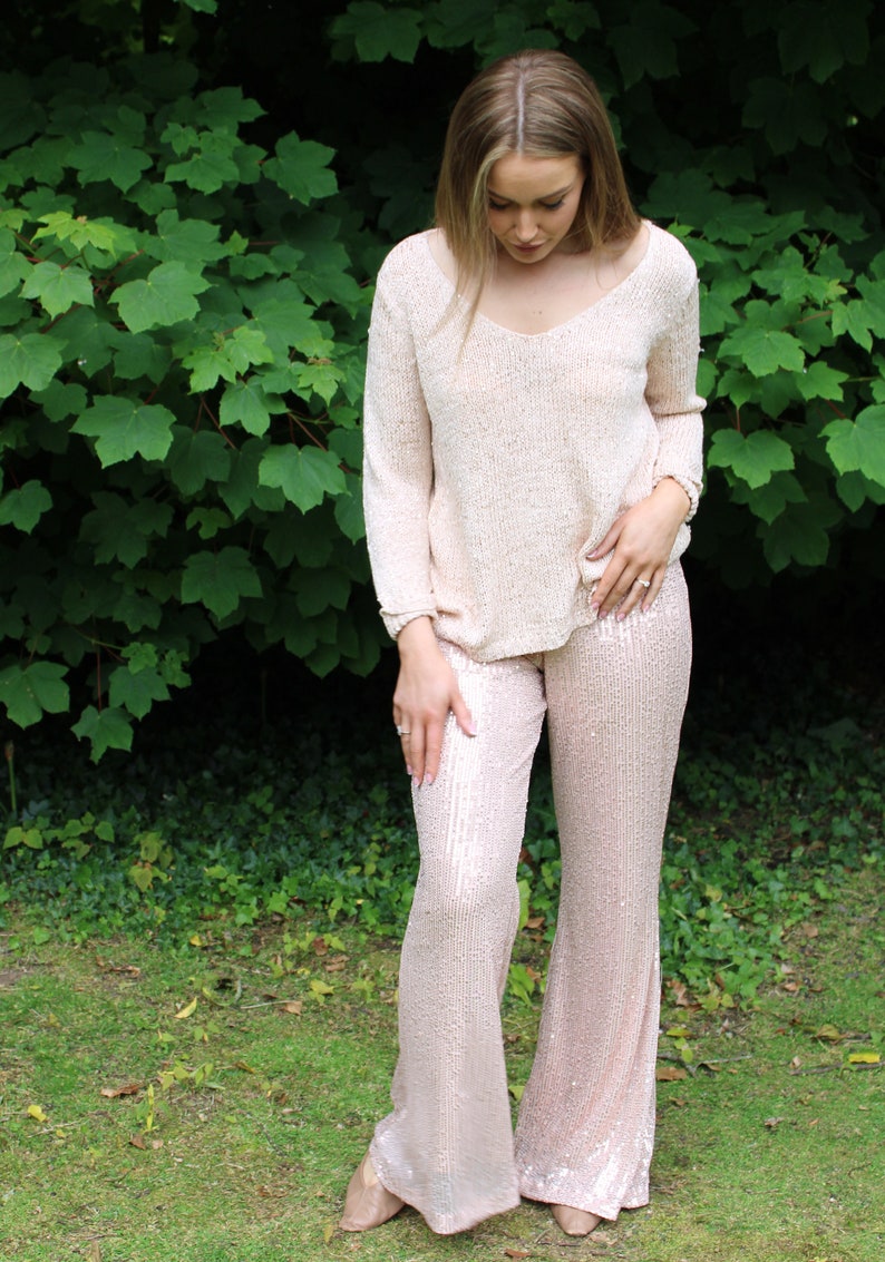 Rose Gold Sequin Pants, Fancy Occasion Stretch Leggings, Wide Flare Palazzo Leg Pants, Bridesmaids Party Wedding