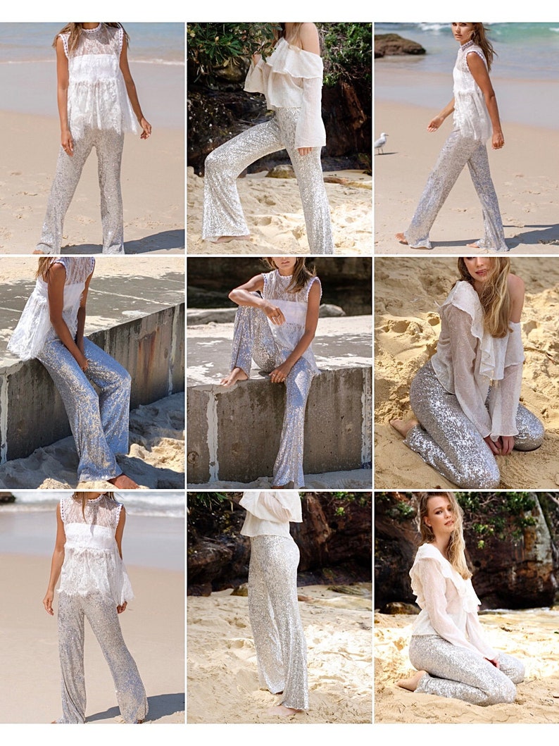 These Silver Sequin Pants are one of a kind outfit that you can wear at any event. The fabric is soft and comfy making it the perfect time of year to wear these pants. Style these pants with a sequin top, some heels and a clutch for a fancy night out or dress them down with sneakers, crop top or blazer for the day and be irresistible wherever you go! The perfect Silver Sequin Pants so you do not go unnoticed.