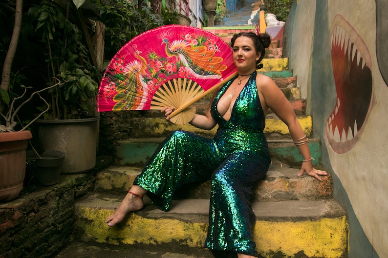 Green Sequin Pants, Emerald Green Sequin Disco Jumpsuit for Women, 1970s Wide Leg Vintage Jumpsuit Style